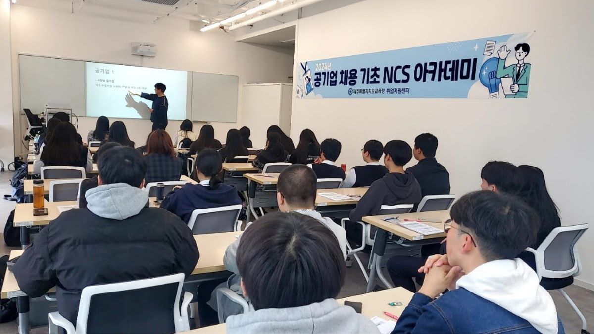 제주특별자치도교육청은 26일 도내 9개 직업계고 학생들을 대상으로 NCS 기반 직무 중심 채용에 대한 전반적인 이해도 향상을 위해 3월 25일과 26일 양일간 도교육청 취업지원센터에서 ‘2024년 공기업 채용 기초 NCS 아카데미’를 운영하고 있다고 밝혔다.