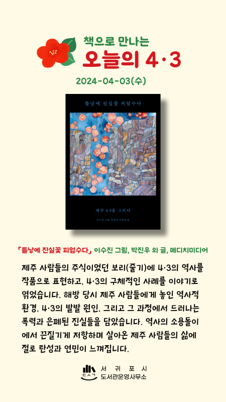 서귀포시 도서관운영사무소는 29일, 제주4·3 76주년을 맞아 4월 1일부터 말까지 특별 온라인 북큐레이션 서비스‘4월은 4·3입니다’를 운영한다고 밝혔다.