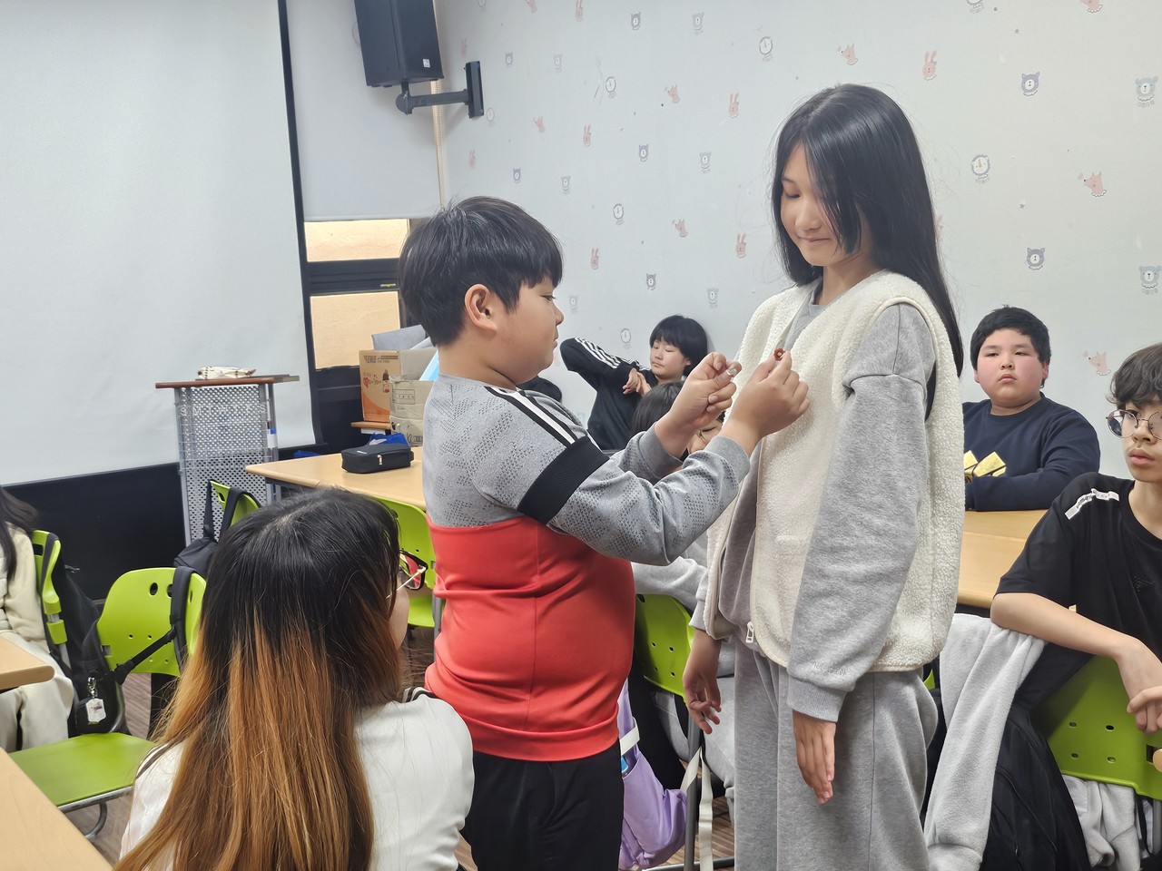 제주4·3 76주년을 맞아 지난 1일 서귀포청소년문화의집 청소년 방과후 아카데미 청소년들이 4·3배지를 서로의 가슴에 달아주면서 4·3의 의미를 되새기고 있다.