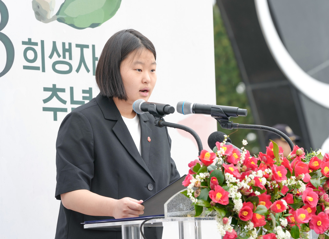 제주여자고등학교 김지원 학생은 4·3을 직접 경험하지 못한 세대이지만 조부모의 이야기를 듣고 그 아픔을 공감하며 쓴 추념시를 낭송하며 전 세대가 4·3을 함께 기억하고 공감하기를 바라는 마음을 전했다.