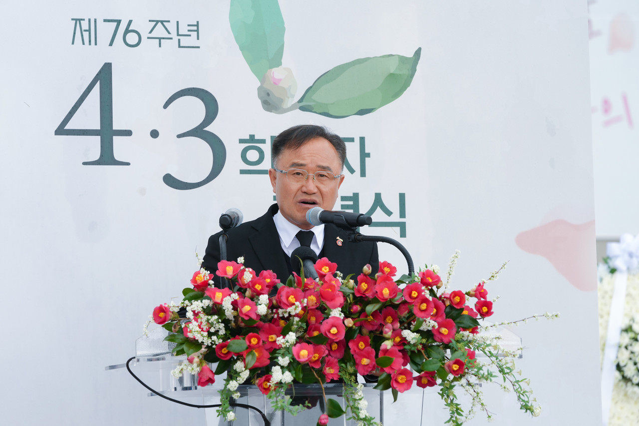 아울러 “혹독한 겨울을 견뎌낸 동백꽃이 치유와 사랑의 꽃망울을 활짝 틔우듯, 긴 어둠을 이겨낸 제주와 4·3이 지구촌 평화 번영을 위한 씨앗으로 뿌려져 다음 세대에 정의로운 미래를 안길 것”이라며 “제주가 열어나가는 사람 중심의 빛나는 미래를 4·3 영령님들과 함께 지켜봐 주시기 바란다”고 덧붙였다.