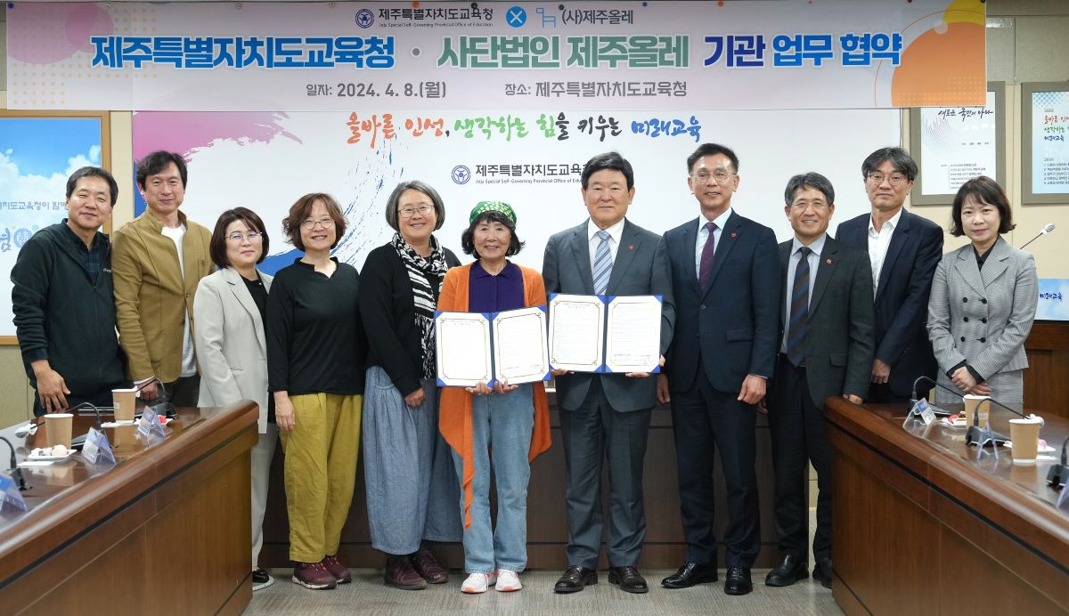 제주특별자치도교육청(교육감 김광수)과 사단법인 제주올레(이사장 서명숙)는 8일 도교육청 상황실에서 업무협약을 체결했다고 밝혔다.