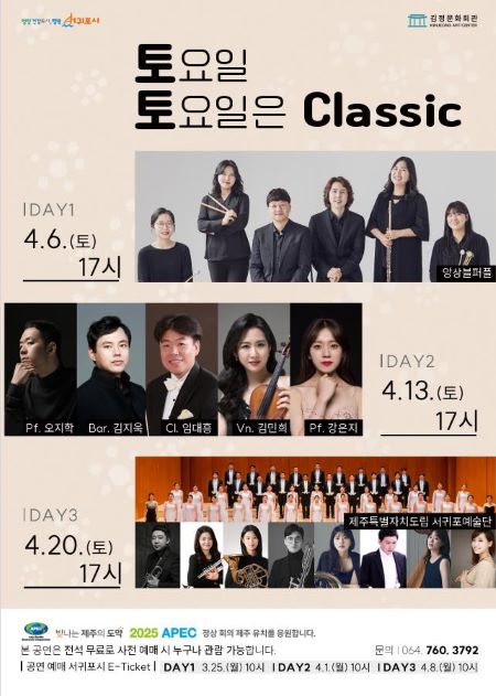 이번 ‘ 토요일 토요일은 클래식 3’ 공연은 무료 공연으로 운영되며 입장권은 서귀포시 E-티켓을 통해 4월 8일부터 예매할 수 있다.