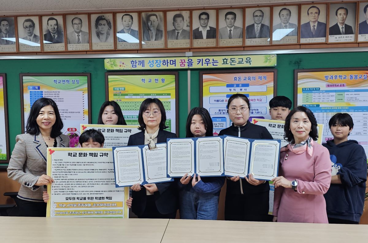 효돈초등학교(교장 오순경)는 지난 12일 학생, 학부모, 교직원 대표가 참여해 모두의 학교를 위한 학교문화 책임 규약 서명식을 진행했다.