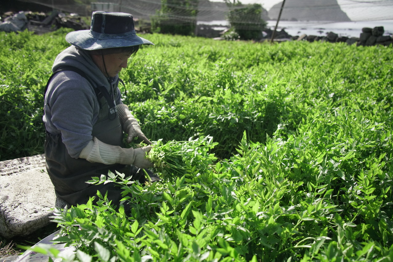 4월 18일 새벽녁 서귀포 토평동 거믄여 해안 인근 ‘미나리꽝’에 미나리가 지천이다. 미나리목 미나릿과 미나리속 여러해살이 풀이다. 미나리를 재배하는 논을 미나리꽝이라고 한다. 서귀포 거믄여 해안 인근 미나리꽝에서 농부가 서귀포의 바닷바람과 봄향기를 머금은 미나리를 수확하고 있다.