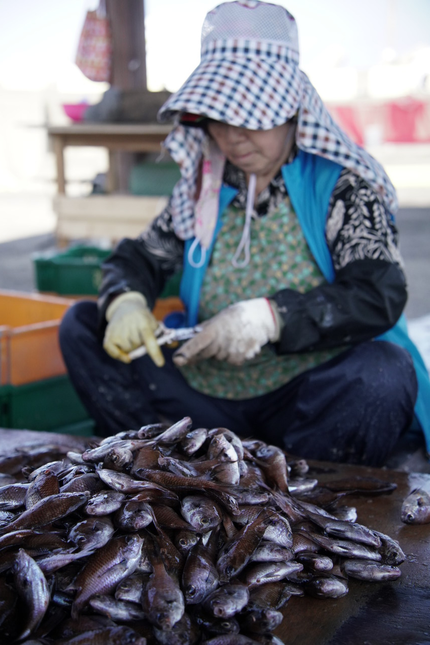 청보리가 바람에 일렁이면서 5월 서귀포 들판에 푸르름을 더하는 가운데 서귀포시 보목마을 포구에는 제철을 맞아 살이 오르고 있는 자리돔이 한창이다. 아낙들이 자리돔을 손질하고 있다.