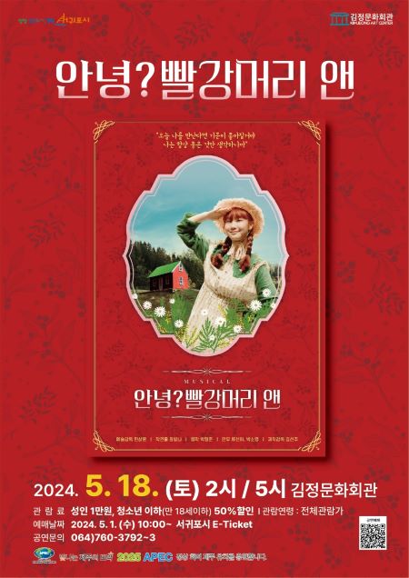 서귀포시 김정문화회관은 오는 18일 가정의 달을 맞이해 가족들이 함께 즐길 수 있는 공연 뮤지컬‘안녕? 빨강 머리 앤’을 오후 2시와 5시, 2회에 걸쳐 상연한다.