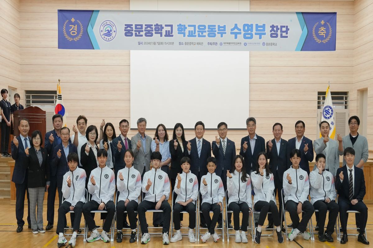 중문중학교(교장 김병성)는 지난 7일 다목적강당에서 수영부 창단식을 개최했다.