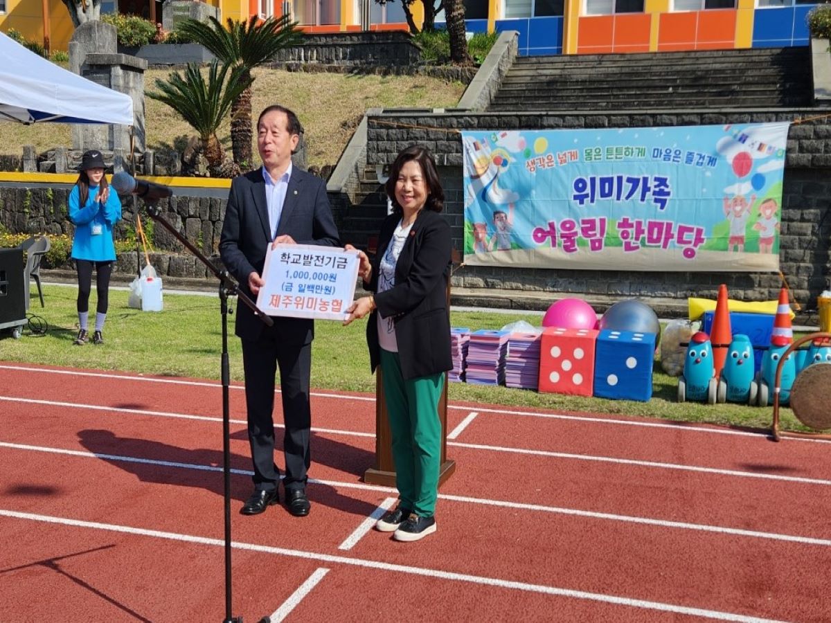 위미초등학교(교장 조수경)는 지난 3일 열린 위미가족 어울림 한마당에서 위미초 총동창회(회장 현동숙)와 위미농협(조합장 현재근)으로부터 학교발전기금을 기탁받았다고 밝혔다.