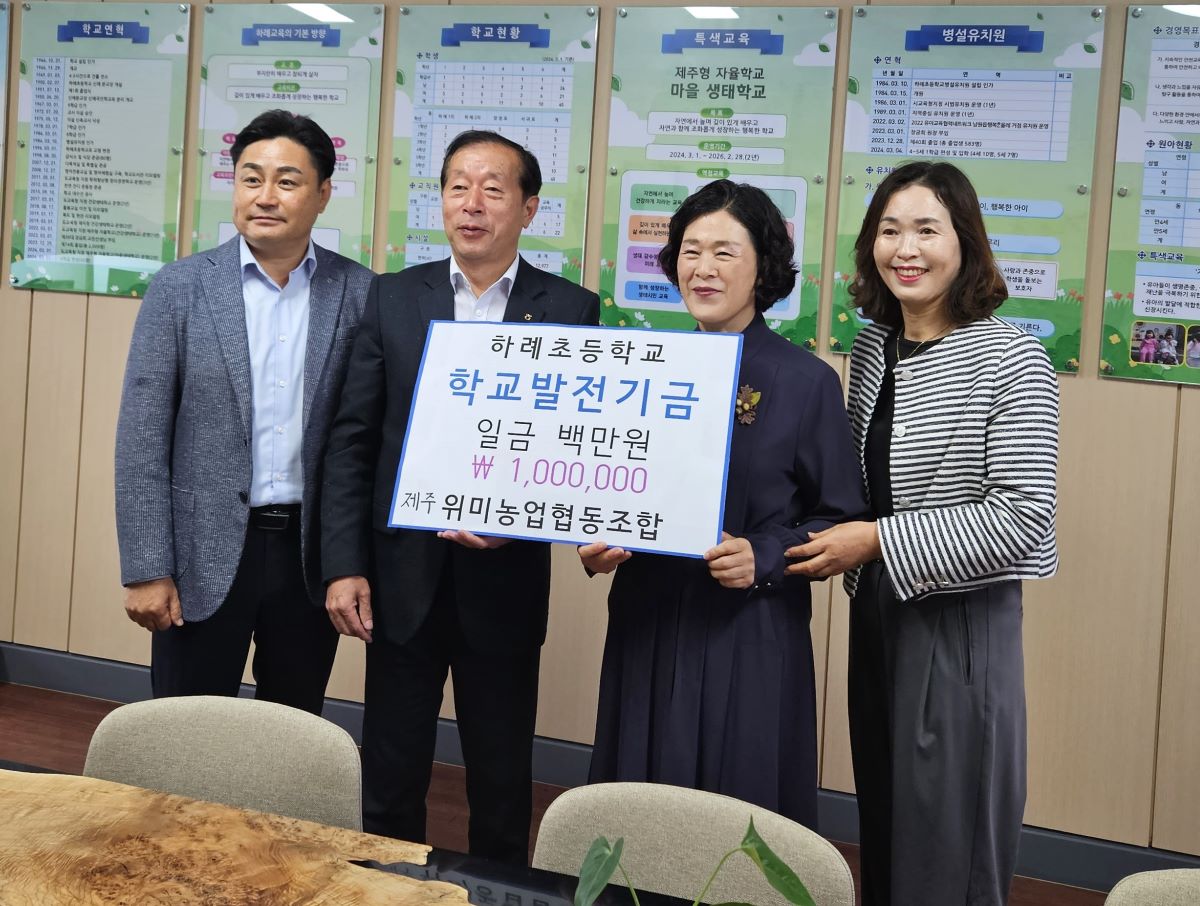 하례초등학교(교장 장금희)는 지난 8일 위미농협협동조합으로부터 학교 발전 기금을 기탁받았다고 밝혔다.