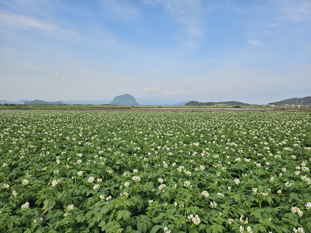 신록의 계절인 5월에 접어들면서 서귀포시 대정읍 농경지에 감자꽃이 활짝피었다. 감자밭 뒤에 펼쳐진 산방산이 감자꽃과 어우러지면서 서귀포의 이색 풍경을 연출하고 있다.