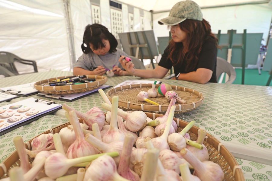 지난 19일, 대정읍 하모체육공원에서 열린 ‘대정 암반수 마농직거래 장터’에서 한 가족이 ‘햇마늘 페인팅’ 이벤트에 참여하고 있다. 청정 대정 지역에서 생산한 마늘에 알록달록 색깔을 입히는 아이 얼굴이 귀여우면서도 진지하다. 이날 행사에서는 햇마늘과 함께 대정읍에서 생산된 감자와 각종 농가공식품을 판매했다.
