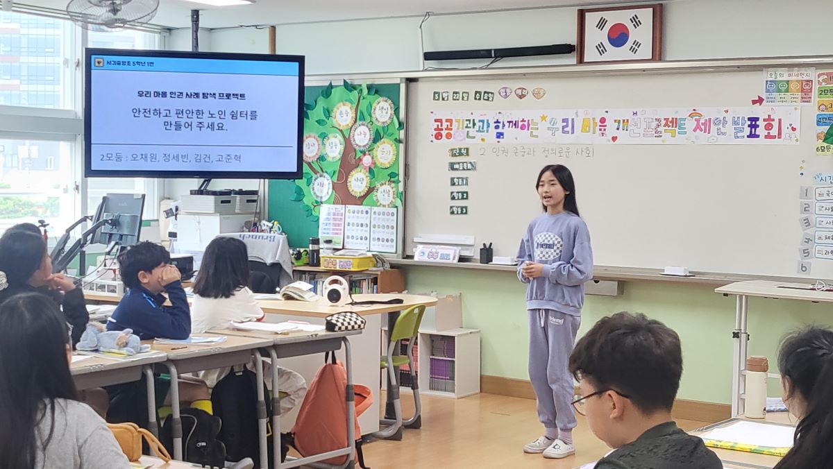 서귀중앙초등학교(교장 고종희)는 지난 22일 5학년 1반에서 공공기관과 함께하는 우리 마을 개선 프로젝트 제안 발표회를 운영했다.