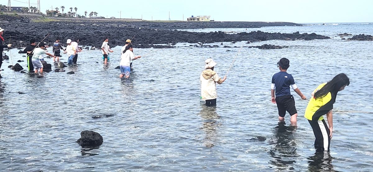 학생들은 해안가에서 낚시대에 직접 미끼를 달아 물속에 있는 고망에 미끼를 넣고 물고기를 낚아보고 보말과 새우도 채집해 관찰하며 즐거운 시간을 보냈다.