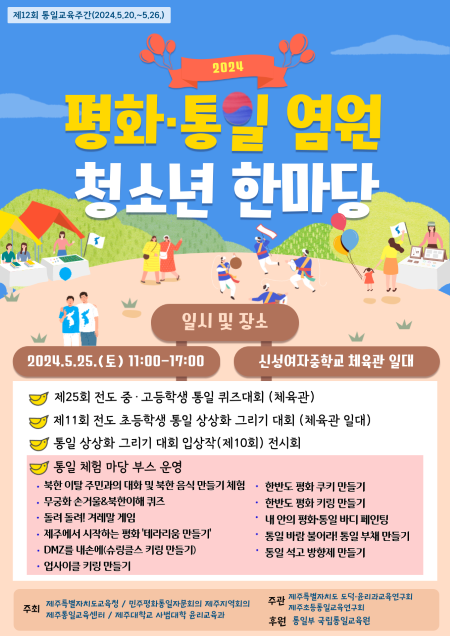 제주특별자치도교육청은 오는 25일 도내 학생들을 대상으로 신성여자중학교에서‘2024 평화․통일 염원 청소년 한마당’을 개최한다고 밝혔다.