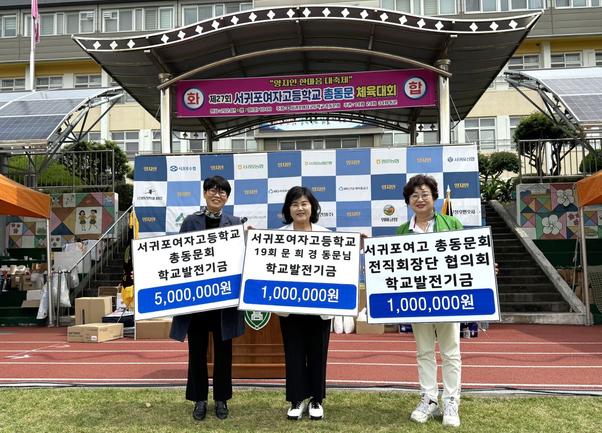 서귀포여자고등학교(교장 양순우)는 지난 2일 서귀포여고 총동문회 체육대회에서 학교발전기금 총 700만 원을 전달받았다고 밝혔다.