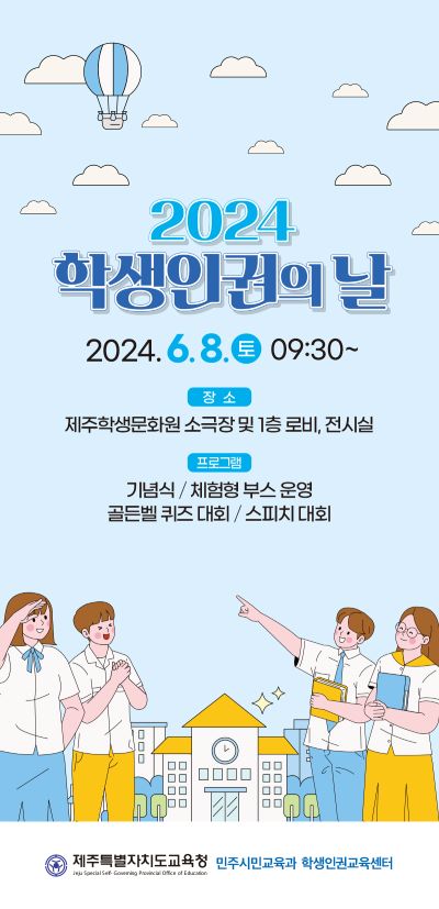 제주특별자치도교육청은 6월 8일 제주학생문화원 소극장 및 1층 로비, 전시실에서‘2024 학생인권의 날’을 운영한다고 밝혔다.