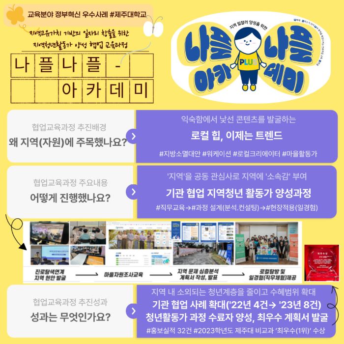 제주대학교(총장 김일환)는 10일 교육부 주관 2024 교육 분야 정부혁신 우수사례 경진대회에서 ‘청년이 직접 그리는(설계하는) 지역 이야기, 지역청년활동가 양성 협업 교육과정: 나플나플* 아카데미(진로취업교육)’ 프로그램이 대상으로 선정됐다고 밝혔다.