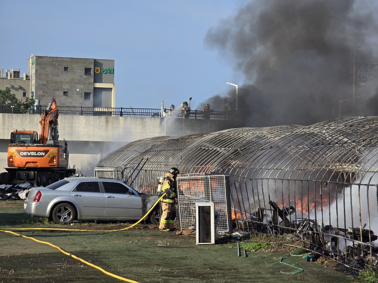 소방당국은 곧바로 진화에 나섰지만, 비닐과 샌드위치 패널 등으로 지어진 가건물 안에 의류와 신발 등 가연성물질이 많아 불길이 쉽게 잡히지 않고 있다.