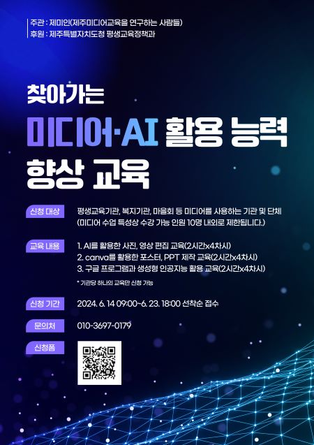 이번 ‘찾아가는 미디어·AI 활용 능력 향상 교육’은 △AI를 활용한 사진, 영상 편집 교육 △Canva를 활용한 포스터, PPT 제작 교육 △구글 프로그램과 생성형 인공지능 활용 교육 등 총 3개의 주제로 진행된다.