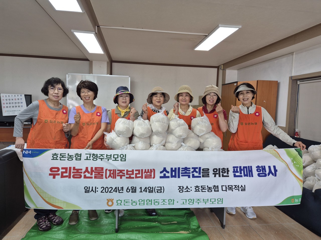 효돈농협(조합장 백성익)과 효돈농협 고향주부모임(회장 김혜정)은 지난 14일 회원 15명이 참여한 가운데 본점 다목적실에서 우리농산물(제주보리쌀) 판매 행사를 실시했다. 이날 판매된 수익금은 지역내 이웃사랑 실천에 적극 활용된다.