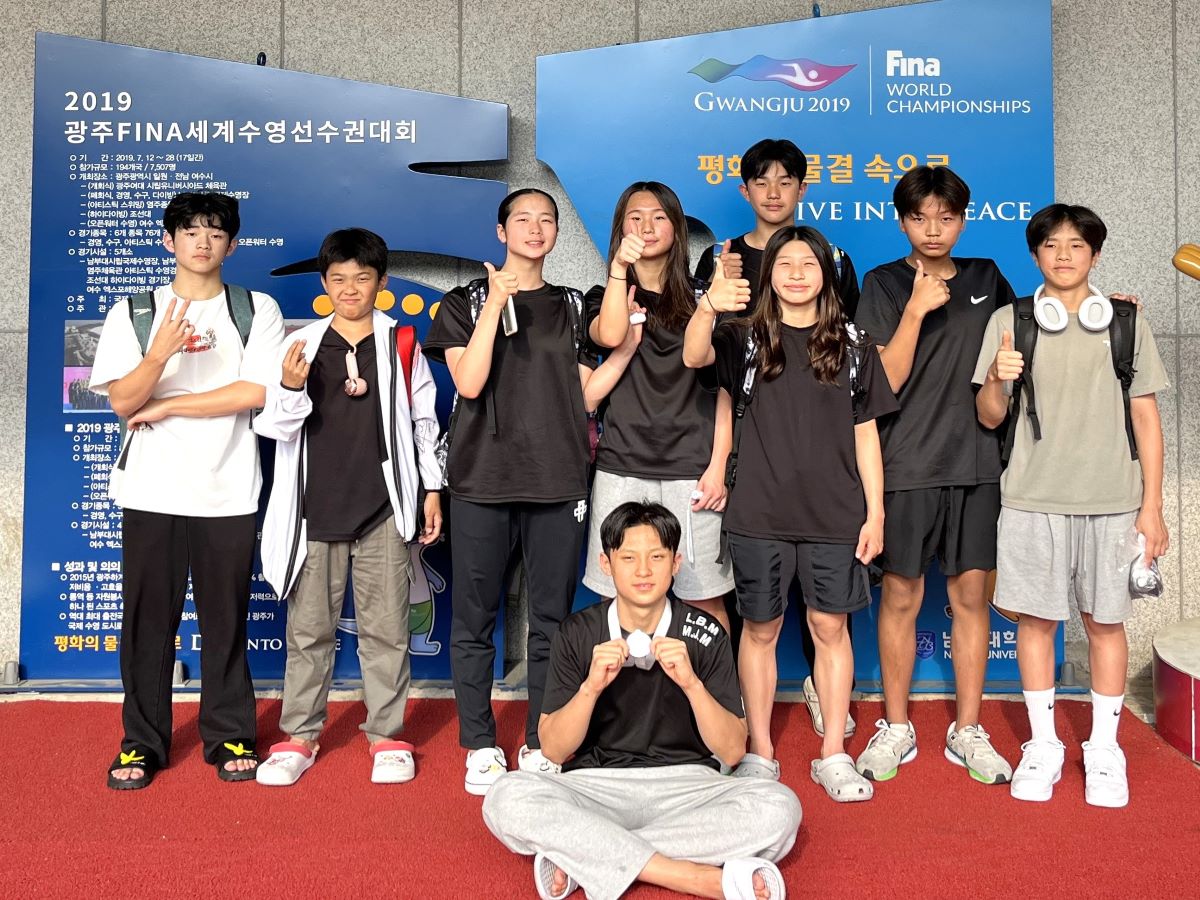 이번 대회에는 문정민 지도자와 수영부 담당 교사 그리고 강승오, 고찬혁, 우주원, 임준범, 조성우, 나원영, 임준서, 조유진, 허태연 등 총 9명의 선수가 참가했다.