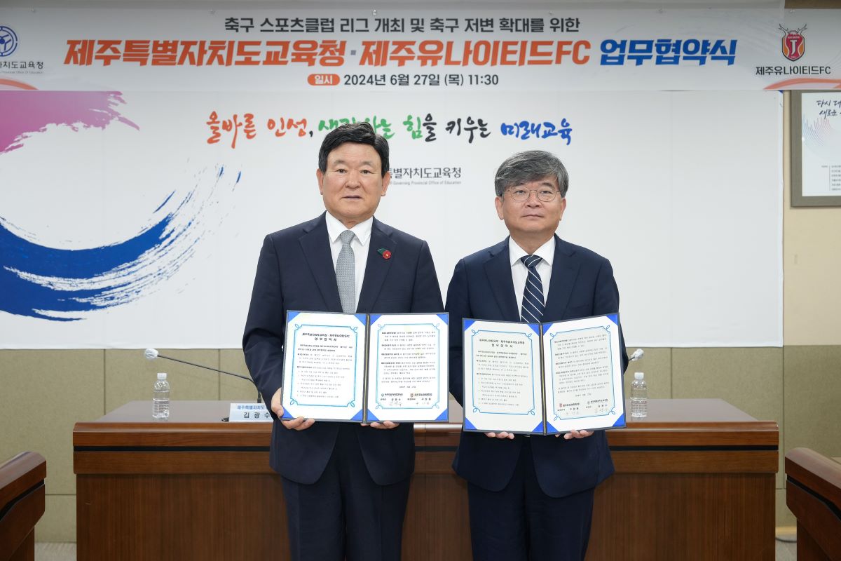 제주특별자치도교육청은 27일 제주유나이티드FC와 축구 스포츠클럽 리그 개최 및 축구 저변 확대를 위한 업무협약식을 개최했다고 밝혔다.