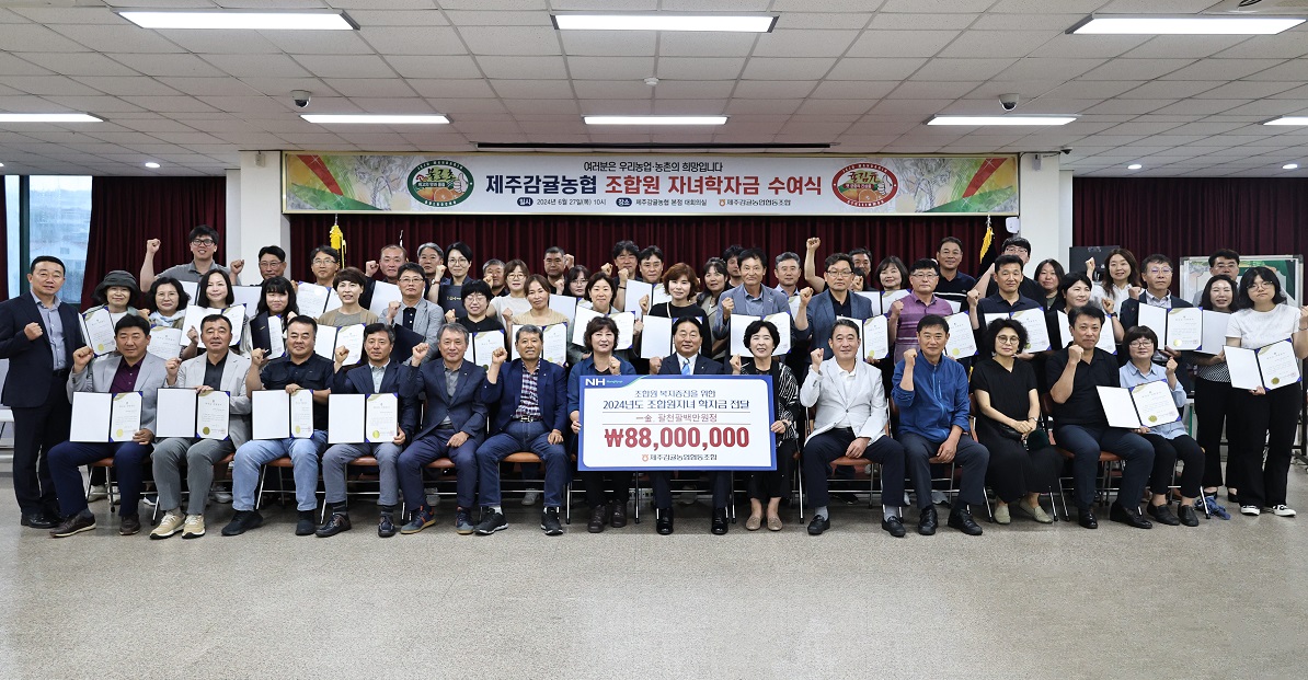 제주감귤농협(조합장 송창구)은 지난 27일 본점 대회의실에서 조합원 및 조합원 자녀, 임직원 등 50여명이 참석한 가운데 2024년도 조합원 자녀 학자금 수여식을 개최했다.