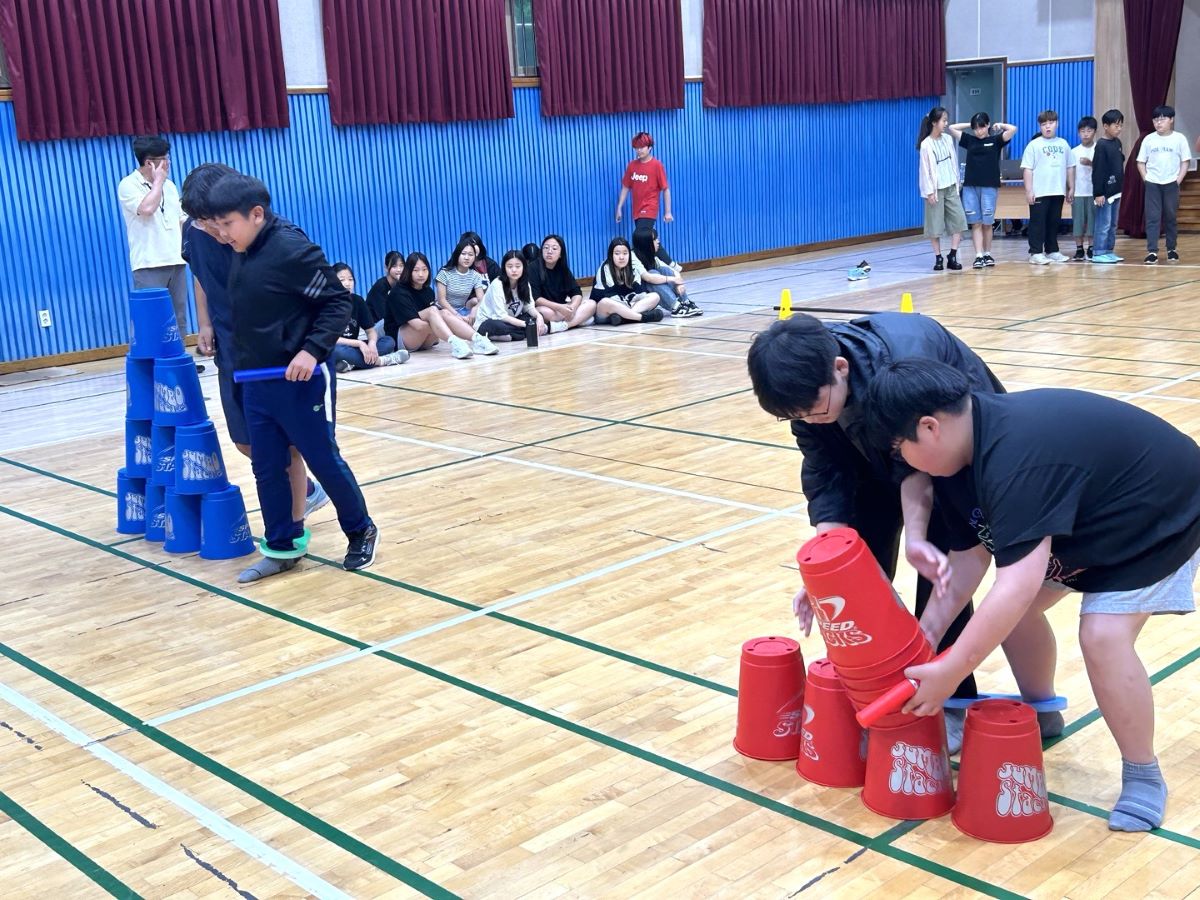 이번 인성 교실은 학생들의 신체 활동을 촉진하고, 협력과 배려의 자세를 배울 수 있는 뉴스포츠 활동으로 팀을 이루어 플로어볼, 협동 컵 쌓기, 판 뒤집기 등 다양한 활동을 했다.