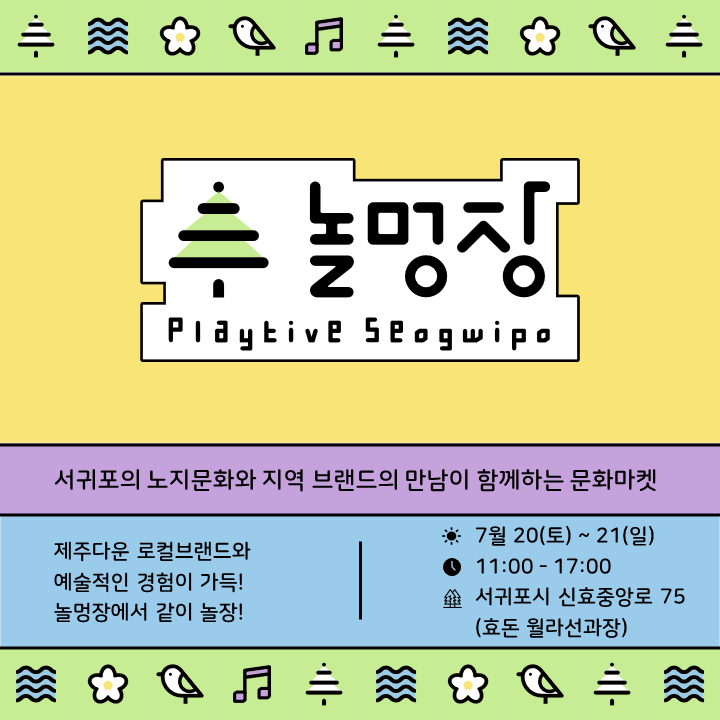 특히 이번 놀멍장은 지역에 활력을 불어넣고, 서귀포의 노지문화를 보다 더 가깝게 느낄 수 있도록 효돈농협의 협조를 통해 여름철 사용하지 않는 월라선과장(신효중앙로 75)에서 진행한다.
