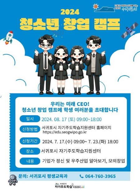 서귀포시는 지역 중학생을 대상으로 다음 달 17일 2024년 청소년 창업캠프 프로그램을 운영한다고 밝혔다.