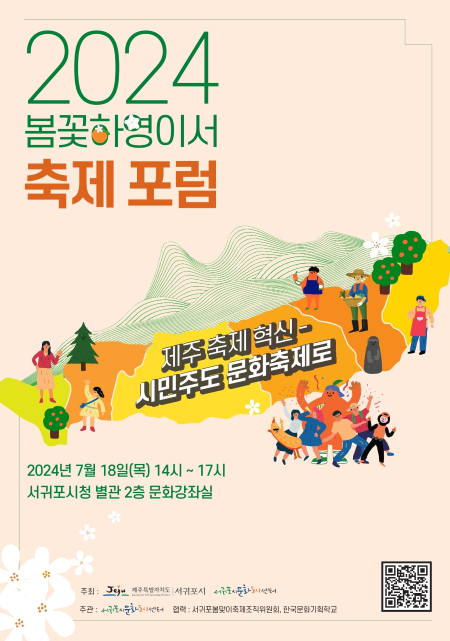 서귀포시와 서귀포시문화도시센터는 오는 18일, 서귀포시청 별관 2층 문화강좌실에서‘제주 축제 혁신 - 시민 주도 문화축제로’라는 주제로 2024 봄꽃하영이서 축제 포럼을 개최한다고 밝혔다.