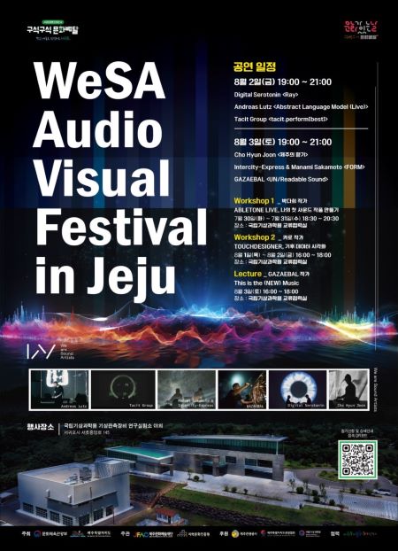 내달 2일과 3일 오후 7시 서귀포 혁신도시에서는 국내ㆍ외 미디어 아티스트 레지던시를 운영하는 WeSA와 함께 미디어 사운드 축제 '위사 오디오 비쥬얼 페스티벌 인 제주(WeSA Audio Visual Festival in Jeju)'가 국립기상과학원의 후원으로 연구실험소 야외에서 야간 축제가 펼쳐진다.