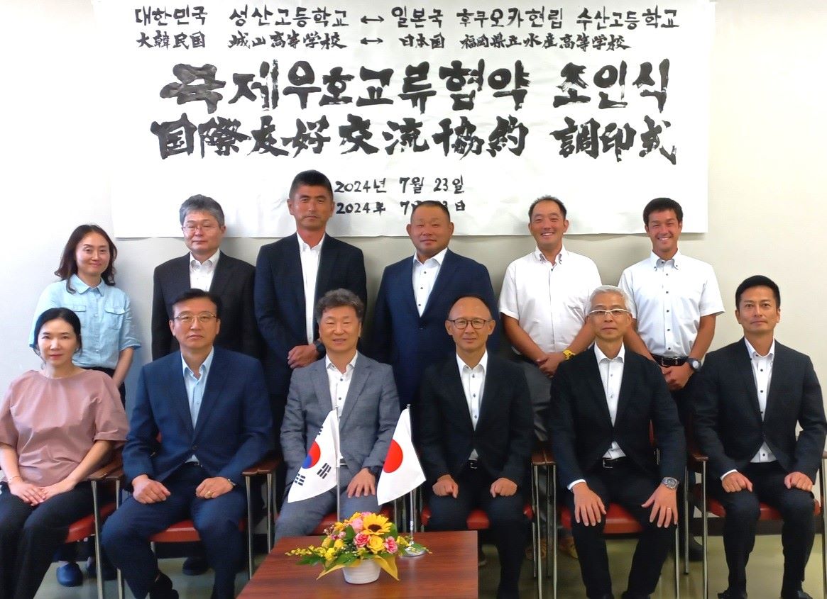 이번 협약식에는 양기봉 성산고 교장 외 3명의 교사와 고가 타케히코 후쿠오카현립수산고 교장 외 7명의 교사 등 양 학교 관계자들이 참석해 협약식을 가졌다.