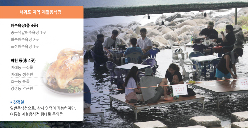 한편 서귀포 지역 계절음식점은 모두 8곳으로 중문색달해수욕장 1곳, 화순해수욕장 2곳, 표선해수욕장 1곳 등 해수욕장은 4곳이고, 하천 등은 논짓물, 생수천, 속골, 악근천 등 4곳이다. 강정천은 일반음식점으로, 한시적으로 영업 신고를 하는 계절음식점이 아닌, 상시 운영이 가능한 음식점이다. 윤주형 기자·구혁탄 인턴기자