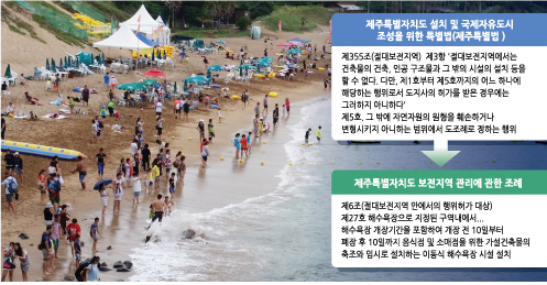 제주특별법이 절대보전지역 관리 등에 관한 사항을 정하도록 위임한 제주도 보전지역 관리에 관한 조례에는 절대보전지역인 해수욕장에서 계절음식점을 운영할 수 있는 근거를 담고 있다.