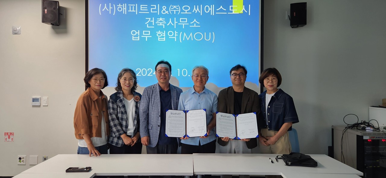 한편, (사)해피트리(이사장 송형록)은 지난 10일 서귀포삼다종합사회복지관 회의실에서 ㈜오씨에스도시건축사사무소(대표 박상범)와 사회공헌사업을 수행하기 위한 업무협약을 체결했다.