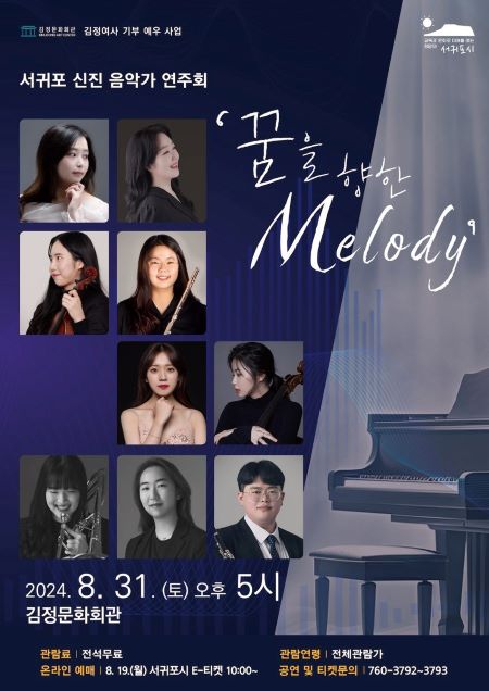 서귀포 신진 음악가 연주회 ‘꿈을 향한 멜로디’는 서귀포에서 중‧고등학교를 졸업한 후 도 내외에서 음악가로 활동하고 있는 20대 음악가들이 성악, 바이올린, 플루트, 첼로, 클라리넷, 트롬본 등 다양한 장르의 음악을 선보인다.