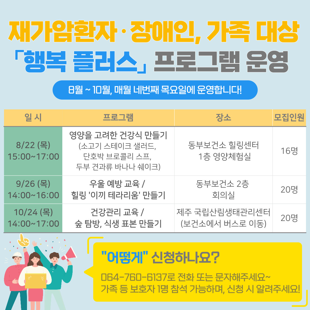 서귀포시 동부보건소는 오는 22일부터 10월 24일까지 매월 네 번째 목요일에 재가암환자와 장애인의 신체·정신 건강관리를 위한 자조모임 ‘행복 플러스’ 프로그램을 운영한다.