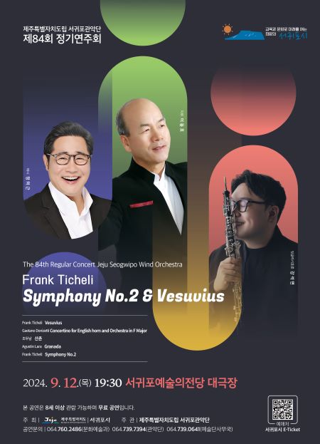 이동호 상임지휘자가 이끄는 도립서귀포관악단의 이번 정기연주회는 현대 관악 작곡의 거장 프랭크 티켈리의 주요 작품과 잉글리시 호른 연주자 강석연과의 협연, 그리고 오페라 이중섭의 주역 테너 정의근의 무대로 펼쳐진다.