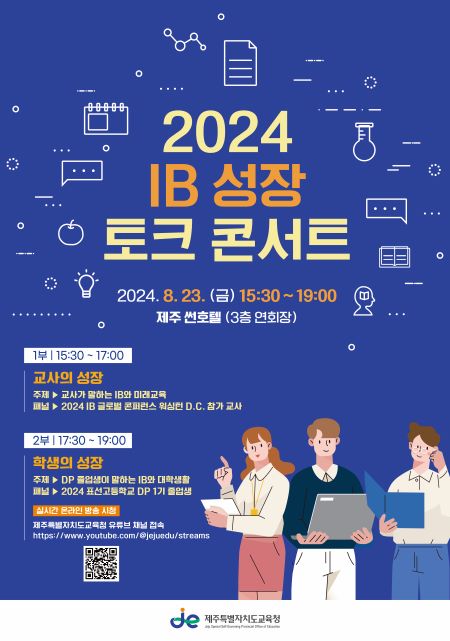 제주도교육청은 오는 23일 오후 3시 30분 제주썬호텔(제주시 소재) 3층 연회장에서 2024 국제바칼로레아(IB) 성장 토크 콘서트를 개최한다고 밝혔다.