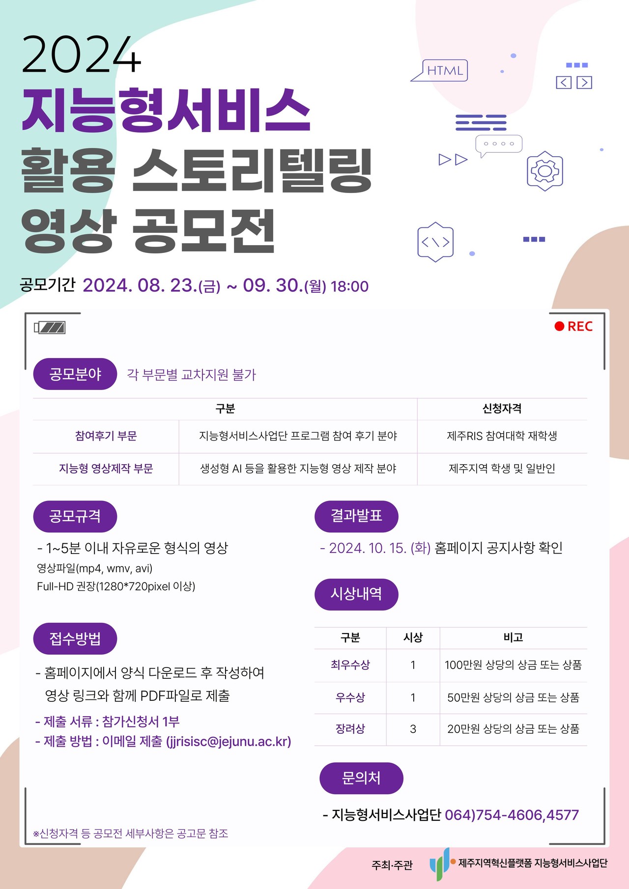 제주대학교는 제주지역혁신플랫폼 지능형서비스사업단(RIS)이 주관하는 '지능형서비스 활용 스토리텔링 영상 공모전'을 오는 8월 23일부터 9월 30일까지 개최한다고 밝혔다.