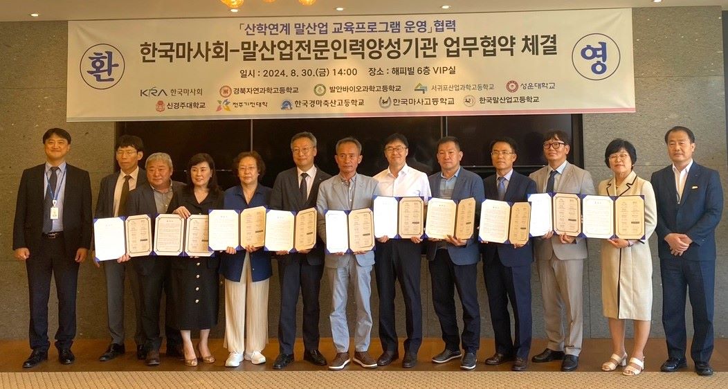 이번 업무협약식에서 한국마사회와 서귀포산과고를 포함한 9개의 말산업 전문 인력 양성센터 각 기관 대표가 산학 연계 전문인력양성 및 교육 환경 조성을 위한 협약을 맺었다.
