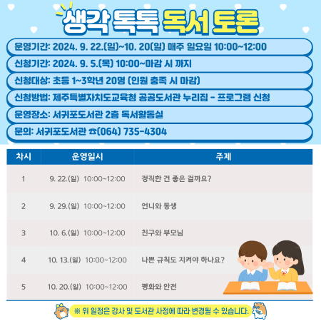 2024년 생각 톡톡 독서 토론 프로그램은 어린이들에게 문학 작품을 읽고 생각을 키우는 기회를 제공하고자 9월부터 총 5회차로 진행된다.