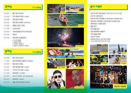 이어 8일에는 검은모래해변 보물찾기, 팔씨름 대회, 너프건 사격대회 등 남녀노소 누구나 참여가능한 다양한 프로그램이 진행되며, 쇠소깍가요제와 초대가수 축하공연이 펼쳐질 계획이다.