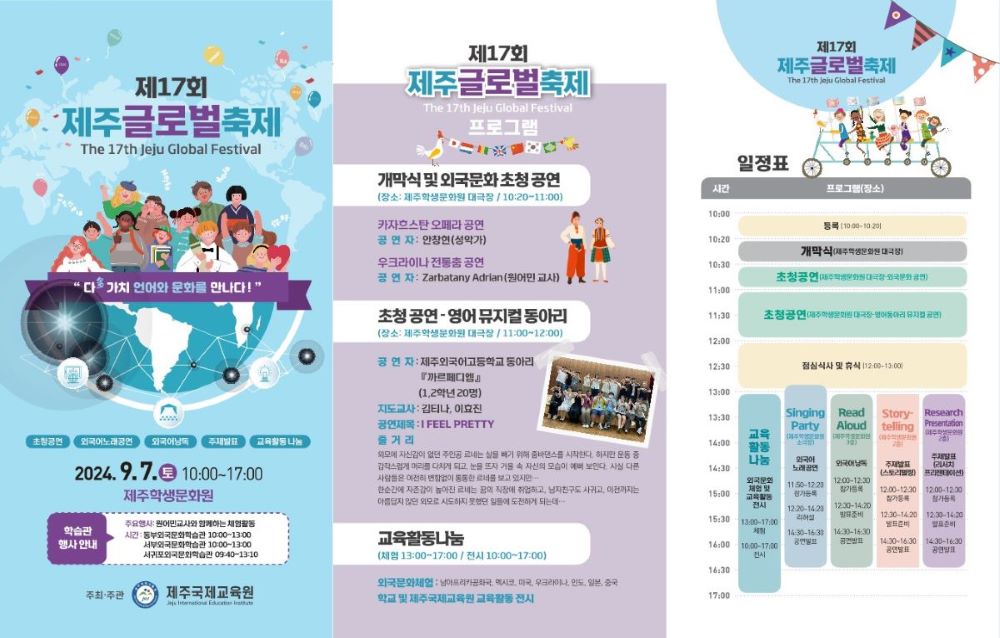 제주국제교육원(원장 이유선)은 오는 7일 오전 10시 제주학생문화원에서 ‘다多가치 언어와 문화를 만나다!’라는 주제로 제17회 제주글로벌축제를 개최한다고 밝혔다.