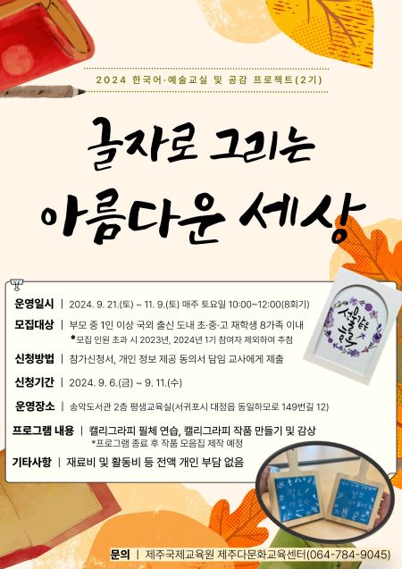제주국제교육원(원장 이유선)은 9일 송악도서관에서 진행되는 2024 한국어·예술 교실 및 공감 프로젝트(project) 2기 참여자를 모집한다고 밝혔다.