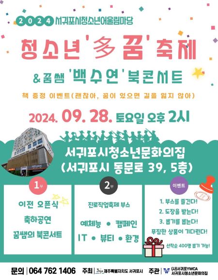 서귀포시와 (사)서귀포YWCA(회장 김정미)에서는 오는 9월 28일 서귀포시청소년문화의집에서 청소년 ‘多, 꿈’ 축제를 개최한다고 밝혔다.