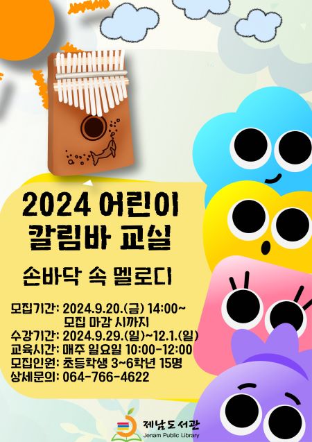 제남도서관은 20일 지역 어린이들을 대상으로 2024 어린이 칼림바 교실 ‘손바닥 속 멜로디’ 프로그램의 수강생을 모집한다고 밝혔다.