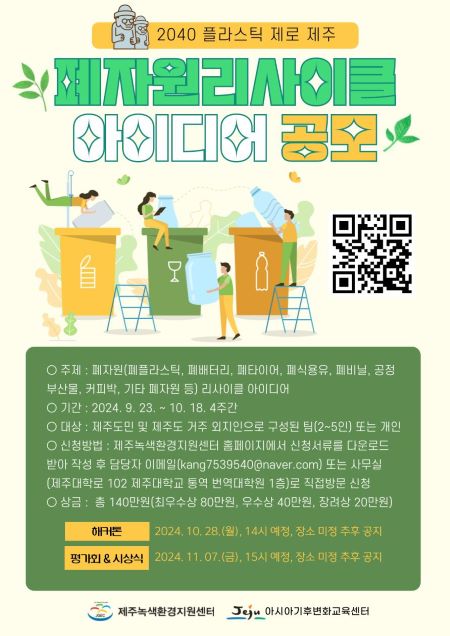 제주녹색환경지원센터(센터장 제주대학교 김진근 교수)는 23일부터 오는 10월 18일까지 도민을 대상으로 폐자원 리사이클 아이디어를 공모한다고 밝혔다.